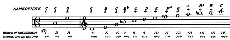 Afin d’aider le lecteur à comprendre l’argument ci-dessus, le tableau suivant présente l’ordre de succession et la hauteur des harmoniques de la note Do (deuxième ligne en dessous de la portée en clé de fa). En prenant, par commodité de calcul, la hauteur de l’octave supérieure au Do central comme étant de 512 vibrations par seconde, on obtient 64 vibrations par seconde pour le Do en question.